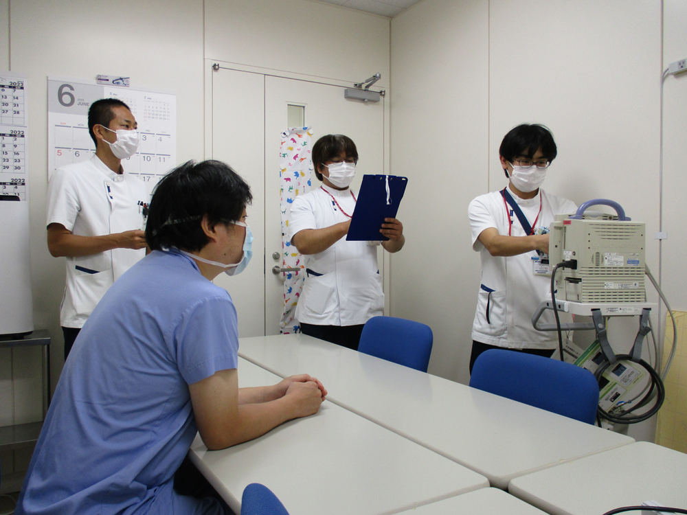 新しい取り組みとして今年度より1年目のスタッフに対して夜勤・遅番業務に入るにあたり、返却台数の多い機器の日常点検やCRRTのプライミング、人工呼吸器セットアップなどの項目を業務時間内に反復演習を行い、業務取得を目指した教育を行っています。