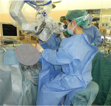 手術は、上級医師の指導のもと、初めは 病棟処置や糸結び・皮膚切開・縫合といった基本的な外科手技を鍛錬し、顕微鏡手術・神経内視鏡手術・カテーテル手術と徐々にレベルをアップしていきます。