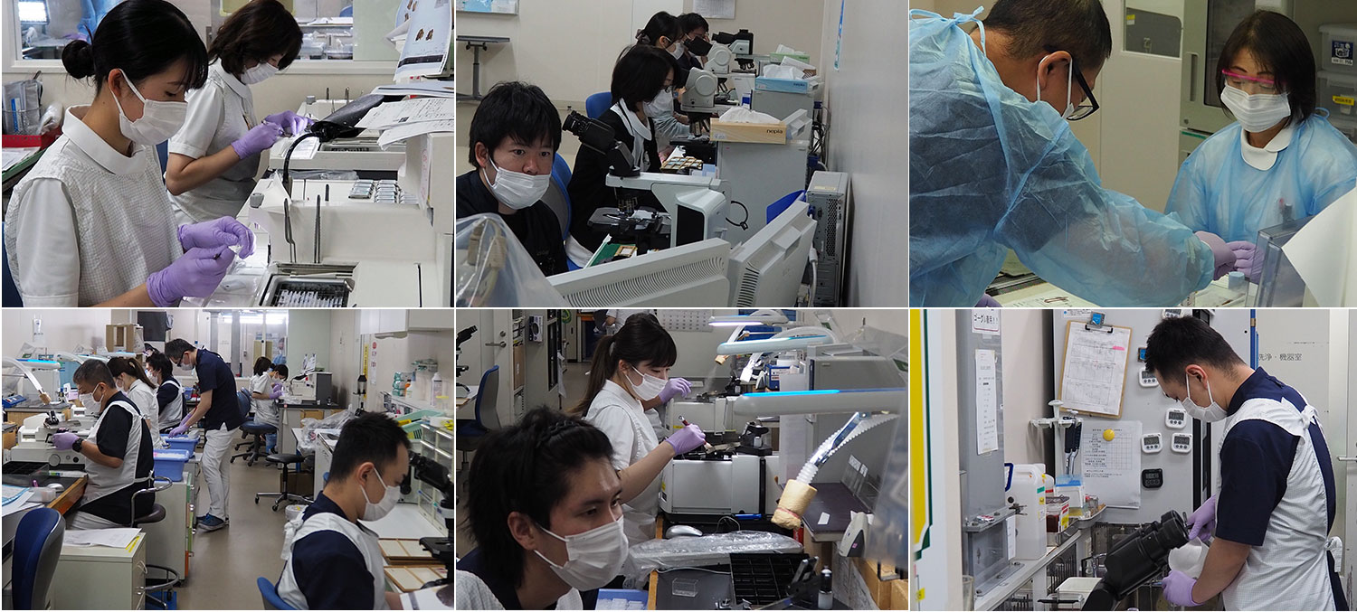 臨床検査技師は6つのパート(迅速診断・検体受付・組織標本作製・分子病理解析・細胞診)を 2週間単位で有資格に沿ってジョブローテーションしています。